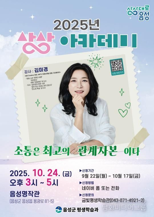 시민행정신문 강갑수 기자 | 음성군은 이달 24일 오후 3시 음성명작관에서 김미경 MK Creative 대표를 초청해 ‘소통은 최고의 관계자본이다’의 주제로 상상 아카데미 강연을 개최한다.
