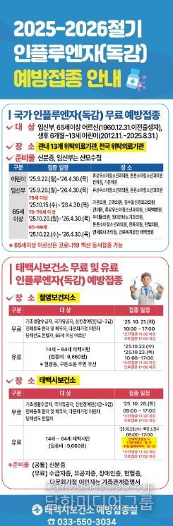 태백시 관계자는 “매년 찾아오는 독감으로부터 나와 가족, 이웃을 지키는 가장 효과적인 방법은 예방접종”이라며 “시민들께서는 반드시 접종 대상과 기관별 일정을 확인해 빠짐없이 접종에 참여해 주시기 바란다”고 당부했다.