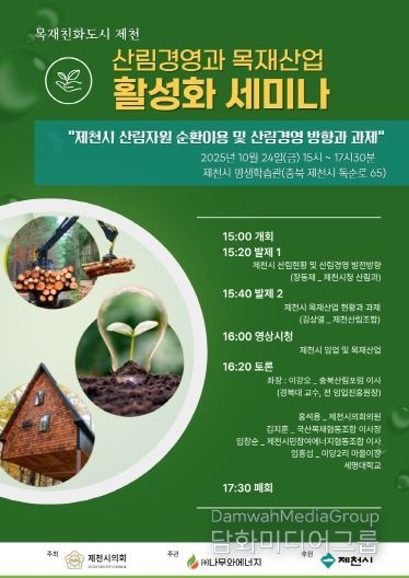 시민행정신문 기자 | 제천시의회은 오는 10월 24일, 제천시 평생학습관에서 ‘목재친화도시 제천의 산림경영과 목재산업 활성화 세미나’를 개최한다.
