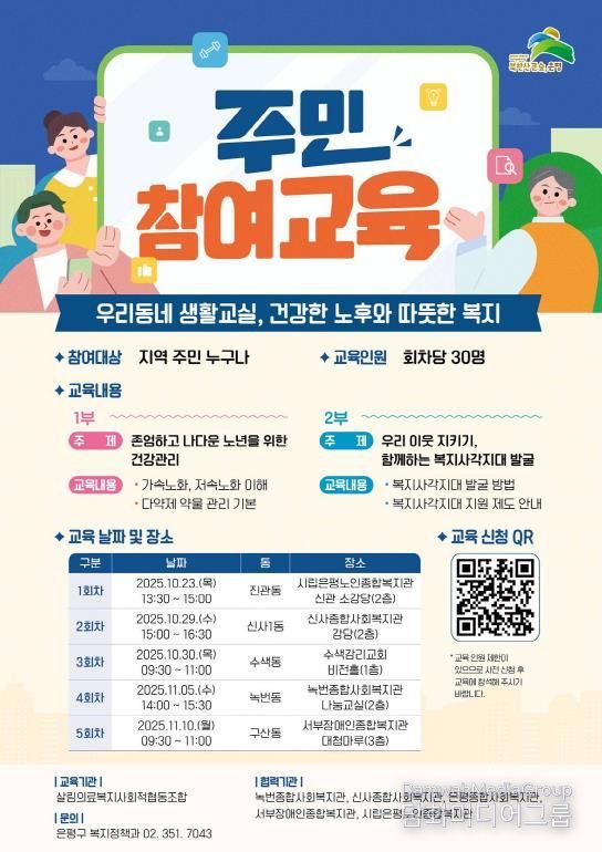 시민행정신문 강갑수 기자 | 서울 은평구는 주민 참여 교육 ‘우리동네 생활 교실, 건강한 노후와 따뜻한 복지’를 운영하고 신청자를 모집한다고 밝혔다.