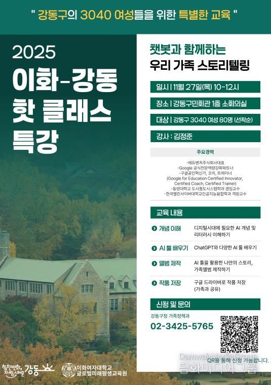 시민행정신문 강갑수 기자 | 강동구가 일과 가정의 양립을 고민하는 3040세대 여성을 위한 '이화-강동 핫 클래스 특강'의 수강생을 오는 27일부터 모집한다고 밝혔다.