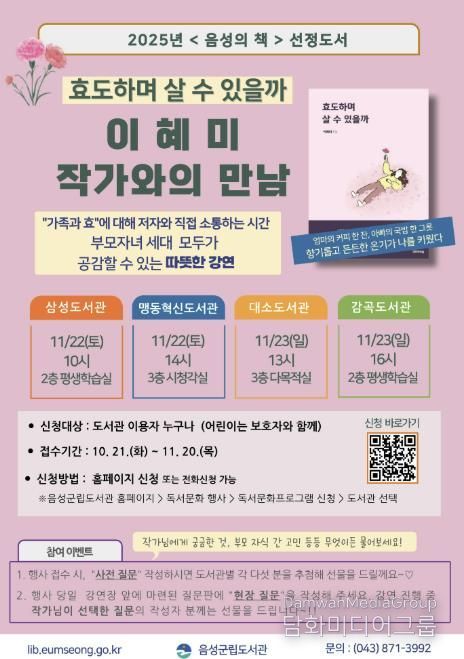 이번 행사는 함께 읽고 공감하며 책으로 소통하는 지역을 만들기 위해 추진 중인 ‘음성의 책’ 사업의 대표 프로그램으로, 오는 11월 22일~23일 양일간 4개의 군립도서관(맹동혁신, 대소, 삼성, 감곡)에서 진행된다