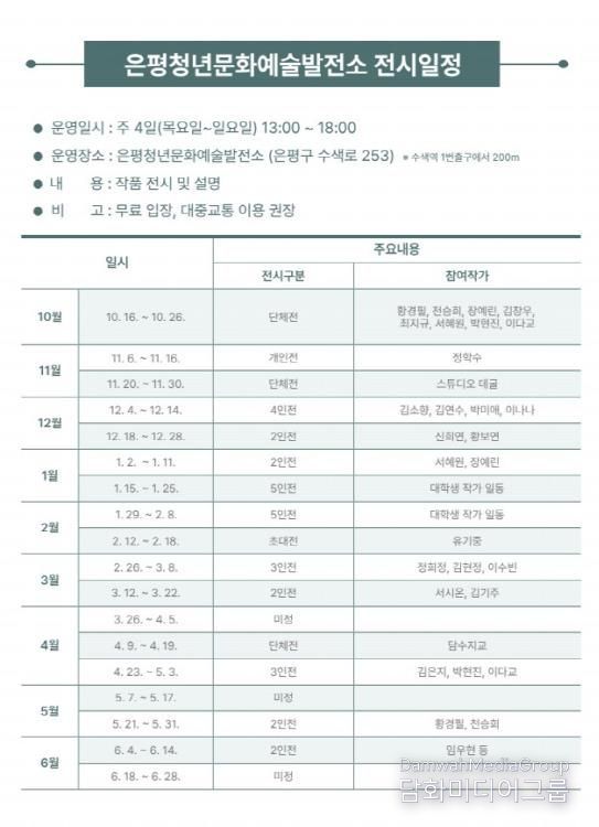 전시는 은평청년문화예술발전소에서 매주 목요일부터 일요일, 오후 1시부터 6시까지 진행되며, 방문객들은 누구나 자유롭게 관람할 수 있다. 특히 매달 2~3회 전시회가 변경돼 새로운 작품들이 계속해서 선보일 예정이니, 은평구민들의 많은 관심과 방문을 바란다.