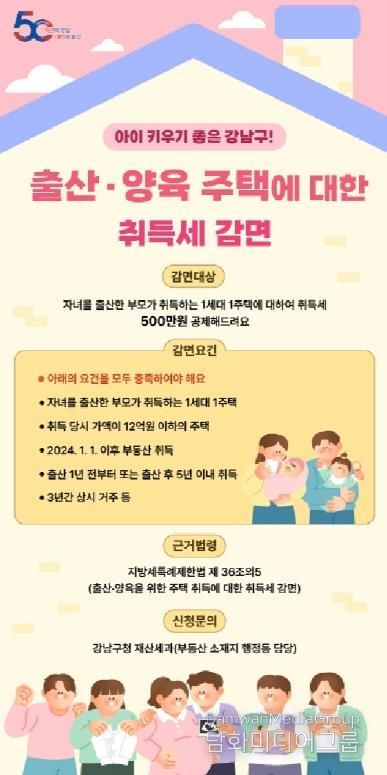 조성명 강남구청장은 “취득세 감면 제도를 통해 출산과 양육이라는 삶의 중요한 전환기에 있는 가정의 부담이 줄어들기를 바란다”며 “앞으로도 구민 눈높이에 맞춘 따뜻하고 공정한 세무 행정을 통해, 아이 키우기 좋은 도시 강남을 만들어가겠다”고 말했다.