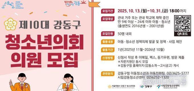 시민행정신문 강갑수 기자 | 강동구는 오는 10월 31일까지 강동구 아동‧청소년을 대상으로 ‘제10대 강동구 청소년의회’ 의원을 모집한다고 밝혔다.