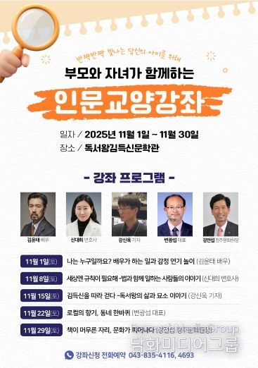 시민행정신문 기자 | 충북 증평군이 내달부터 독서왕김득신문학관 2층 문예배움실에서 ‘부모와 자녀가 함께하는 인문교양강좌’를 연다.