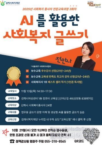 시민행정신문 강갑수 기자 | (재)김해시복지재단은 사회복지 종사자의 글쓰기 역량과 인공지능 활용 능력 강화를 위해 오는 11월 13일 ‘AI를 활용한 사회복지 글쓰기’ 전문교육을 개최할 예정이라고 밝혔다.