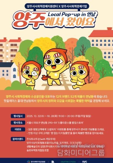 ‘양주에서 왔어요(Local Pop-up in 연남)’는 10월 22일 28일 오전 11시부터 오후 8시까지(주중·주말 동일) 운영되며, 방문객을 위한 ‘스탬프 이벤트’와 ‘양주시 디지털 룰렛 경품 행사’ 등 다양한 체험 이벤트도 함께 진행한다.