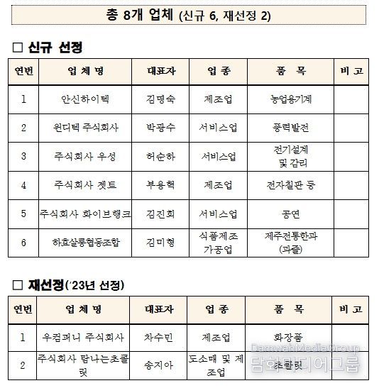 신규 선정된 6개 업체는 △첨단 초미립자 분사기술과 스마트 방제 시스템을 보유한 ‘안신하이텍 주식회사’ △ 풍력발전 전 주기에 걸친 전문성과 실적을 보유한 ‘윈디텍 주식회사’ △전기·통신·소방 분야의 풍부한 설계·감리 실적과 전문 기술력을 보유한 ‘주식회사 우성’ △스마트 교육기자재와 탄소중립 자원화 기술을 융합한 전문성을 기반한 ‘주식회사 젯트’ △제주 특화 콘텐츠를 지속 개발하고 제주 문화의 대외 확산에 기여한 ‘주식회사 화이브행크’ △ 제주 감귤과 전통 한과‘과즐’을 중심으로 6차 산업모델을 구축하고 국내외 판로 확대를 추진하는 ‘하효살롱협동조합’이다.