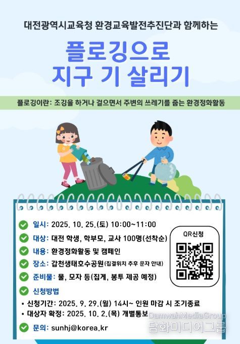 시민행정신문 기자 | 대전시교육청은 10월 25일 갑천생태호수공원에서 가정‧지역 연계 생태전환교육 실천 확산을 위한 2025년 '지구 기살리기 캠페인' 플로깅을 실시한다고 밝혔다.