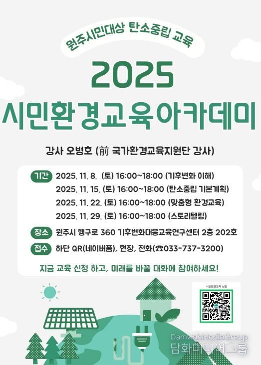 시민행정신문 강갑수 기자 | 원주시는 기후 인식 제고와 생활 속 탄소중립 실천 확산을 위해 오는 11월 8일부터 29일까지 ‘2025 시민환경교육 아카데미’를 운영한다.