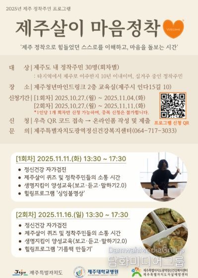 시민행정신문 강갑수 기자 | 제주특별자치도와 광역정신건강복지센터는 정착주민의 정신건강 증진과 자살예방 인식 확산을 위해 '2025년 정착주민 자살예방 프로그램'에 참여할 도민을 모집한다.