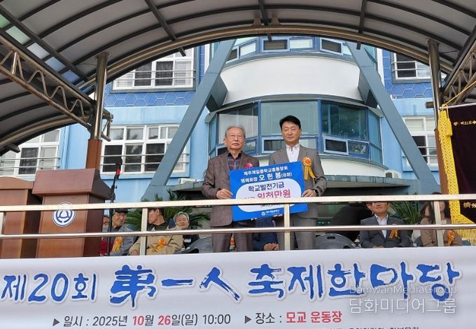 시민행정신문 기자 | 제주도교육청 제주제일중학교는 26일 열린 제20회 제주제일중학교 총동문회‘제일인(弟一人) 축제 한마당’에서 제8회 졸업생 오헌봉 ㈜유성건설 회장이 학교 발전을 위해 2025년부터 2027년까지 3년간 매년 1천만 원씩, 총 3천만 원의 발전기금을 기탁하기로 하고 첫 해분 1천만 원을 전달했다고 밝혔다.
