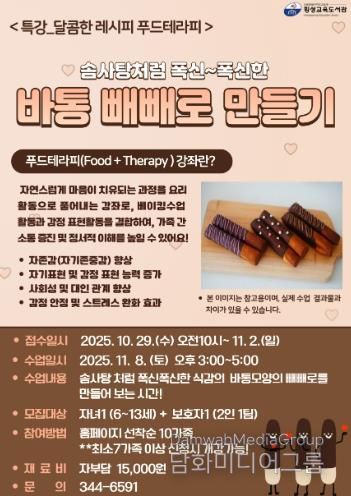 시민행정신문 기자 | 횡성교육도서관은 11월 8일 ‘달콤한 레시피 푸드테라피’라는 주제로 ‘솜사탕처럼 폭신한 바통 빼빼로 만들기’를 진행한다.