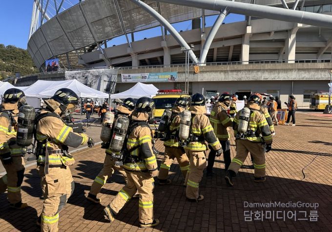 현장훈련은 ▲최초 사고신고 및 전파 ▲자위소방대 활동 ▲소방서 선착대 도착 및 긴급 구조통제단 활동 ▲통합지원본부로 지휘권 이양 후 수습복구 활동 순으로 진행됐다.