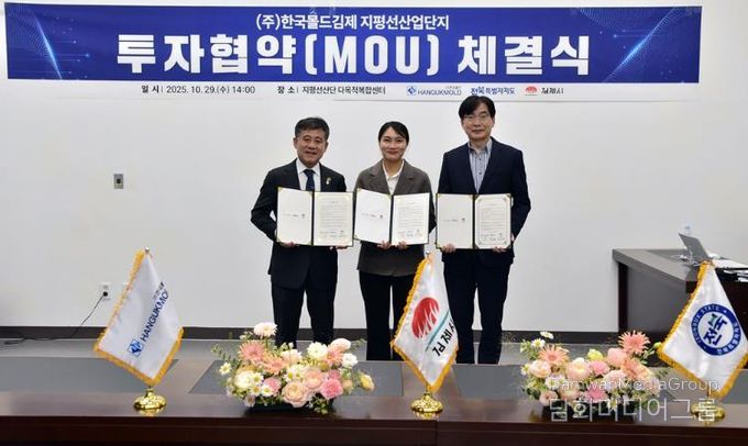 시는 29일 자동차 부품 생산 전문기업 ㈜한국몰드김제(대표 고일주, 고선영)와 지평선일반산업단지 다목적복합센터에서 123억 원 규모의 투자협약(MOU)을 체결했다고 밝혔다.