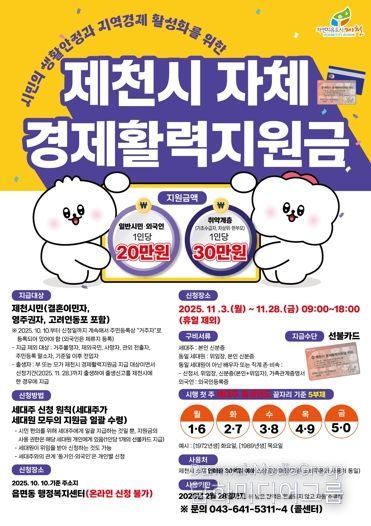 시민행정신문 기자 | 제천시는 자체 예산인 ‘통합재정안정화기금’을 활용하여 ‘제천시 자체 경제활력지원금’을 11월 3일 오전 9시부터 신청 기간 내에 읍면동 행정복지센터에서 선불카드로 지급한다(지류상품권 불가).