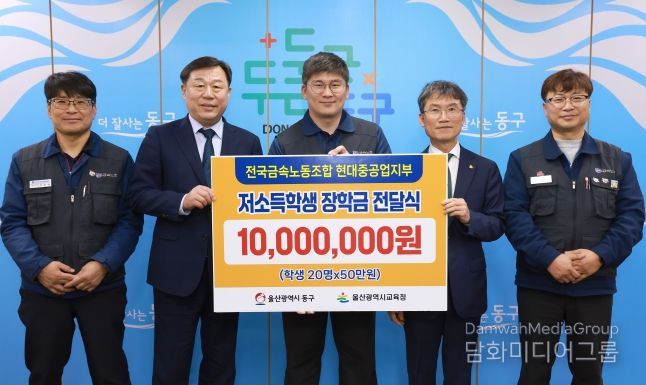 김종훈 동구청장은 “어려운 환경에서도 학업을 이어가는 학생들을 위해 따뜻한 마음으로 장학금을 기탁해주신 현대중공업지부에 깊이 감사드린다,”라며, “이번 장학금이 학생들에게 큰 용기와 희망이 되기를 바라며, 우리 구에서도 학생들이 꿈을 키워나갈 수 있도록 지속적으로 노력하겠다”고 말했다.
