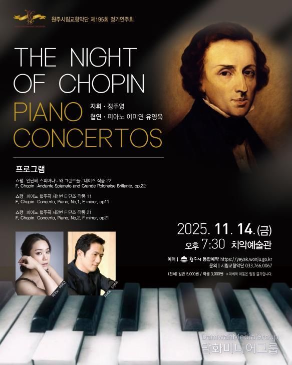 시민행정신문 기자 | 원주시립교향악단은 오는 14일 오후 7시 30분, 치악예술관에서 제195회 정기연주회 ‘The Night of CHOPIN’을 개최한다.