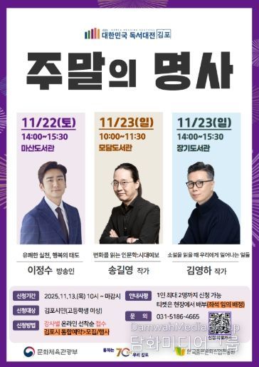 시민행정신문 기자 | 김포시는 ‘2025 대한민국 독서대전’의 일환으로 시민이 책과 인문 강연을 통해 삶의 방향을 모색할 수 있는 인문 강연 『주말의 명사』를 오는 11월 22일부터 23일까지 3개 도서관에서 진행한다.
