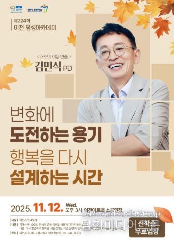 시민행정신문 기자 | 이천시는 오는 11월 12일 오후 3시, 이천아트홀 소공연장에서 제224회 이천평생아카데미를 개최한다. 이번 아카데미에는 MBC 드라마 프로듀서(PD) 출신이자 저널리즘 교수로 활동 중인 김민식 교수를 초청해 ‘변화에 도전하는 용기, 행복을 다시 설계하는 시간’이라는 주제로 특별 강연을 진행한다.