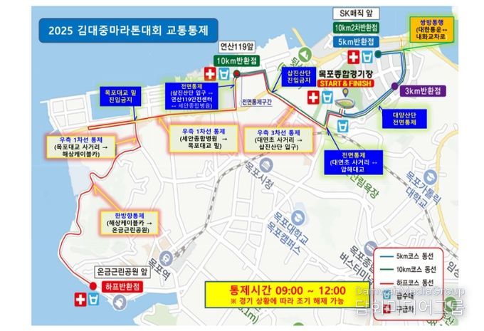시민행정신문 강갑수 기자 | 목포시는 오는 11월 23일 오전 9시부터 12시까지 목포종합경기장 및 시 전역 일원에서 ‘2025 김대중 마라톤대회’가 개최됨에 따라 도로 일부 구간에 대해 교통통제를 실시한다고 밝혔다.