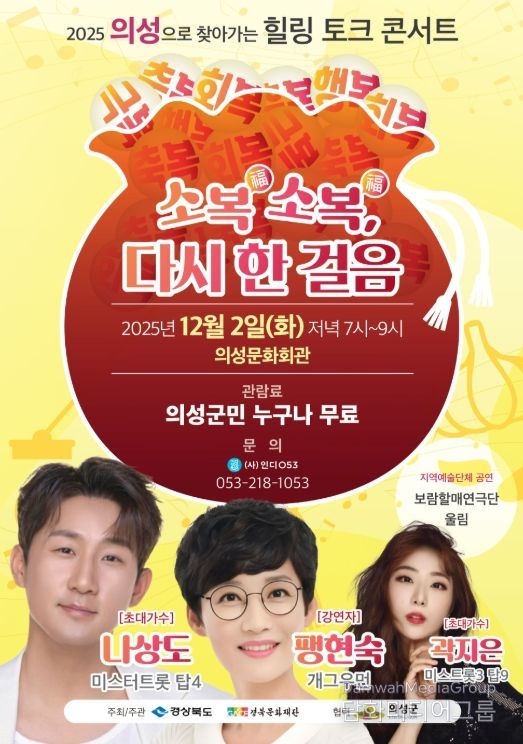 시민행정신문 강갑수 기자 | 의성군은 경상북도와 경북문화재단이 올해 상반기 산불로 피해를 입은 지역민들을 위로하기 위해 추진 중인 치유형 문화예술행사 '찾아가는 힐링 토크콘서트 – 소복소복, 다시 한 걸음'의 마지막 공연을 오는 12월 2일 오후 7시, 의성문화회관에서 개최한다고 밝혔다.