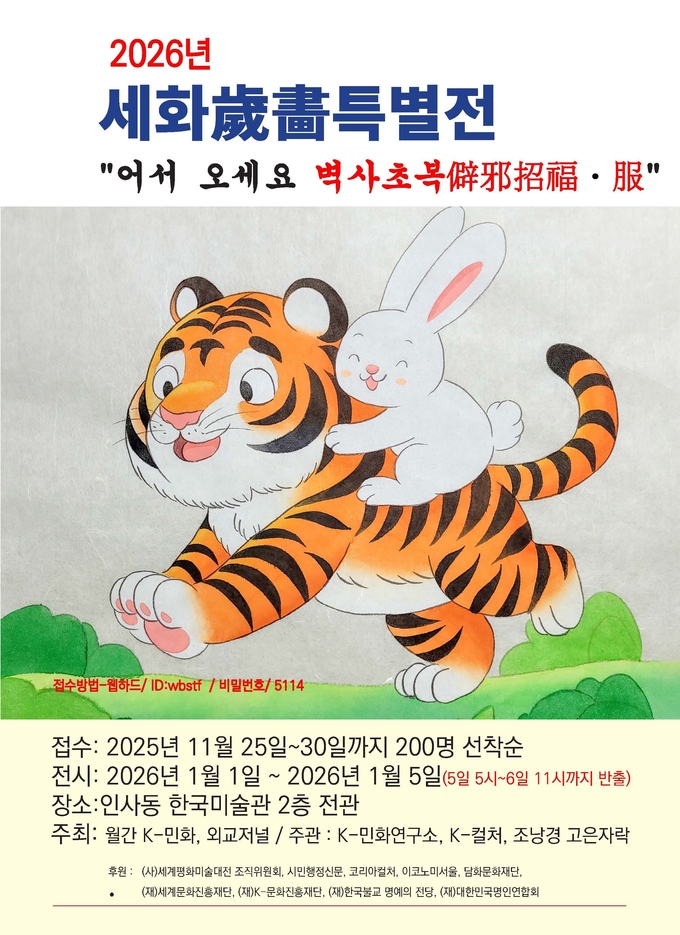 시민행정신문 이존영 기자 | 2026년 병오년 새해, 한국의 전통 민화가 새로운 세계화를 향해 힘차게 날갯짓한다. 월간 K-민화 담화 이존영 발행인은 2026년 1월 1일부터 5일까지 인사동 한국미술관 2층 전관에서 「2026 세화전 歲畵展 ‘어서 오세요 벽사초복’」 특별전을 개최한다고 밝혔다.