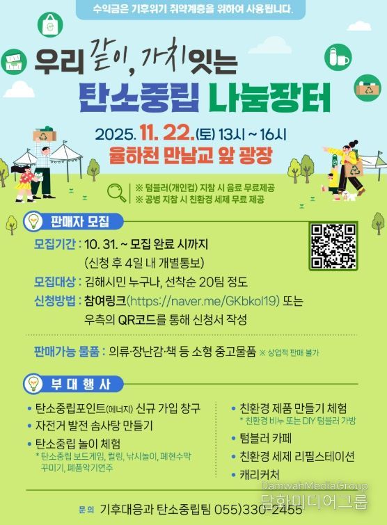 시민행정신문 김학영 기자 | 김해시는 김해시기후환경네트워크와 함께 오는 22일 율하유적전시관 앞 광장 일원에서 ‘우리 같이, 가치 잇는 탄소중립 나눔장터’를 개최한다고 20일 밝혔다.