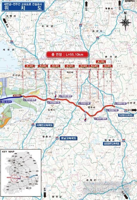 새만금-전주 고속도로는 전라북도 김제시 진봉면에서 전주시를 거쳐 완주군 상관면을 연결하는 총 연장 55.1km의 왕복 4차로 도로로 총사업비 2조 7,424억원을 투입했다.