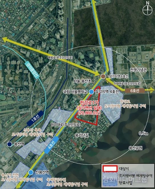 한강로1가 도시정비형 재개발구역은 지하철 4, 6호선 삼각지역 역세권 내에 위치하여 2025 도시환경정비기본계획(2016)에 따라 정비예정구역으로 지정되어 도심 기능연계, 노후 주거환경 정비 등을 목표로 용산구에서 정비구역 지정 및 정비계획(안) 마련을 추진했다.