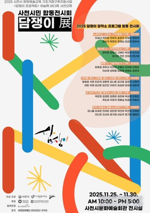 시민행정신문 강갑수 기자 | 사천문화재단은 오는 11월 25일부터 11월 30일까지 2025 사천시문화예술회관 전시실에서 담쟁이 프로젝트 합동 전시회 '담쟁이 展'을 개최한다.