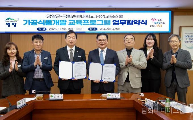 시민행정신문 강갑수 기자 | 영암군이 20일 군청에서 국립순천대 평생교육스쿨과 ‘가공식품개발 교육프로그램 업무협약’을 체결했다.
