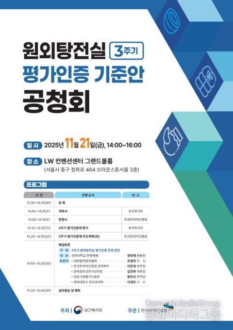 시민행정신문 이존영 기자 | 보건복지부가 주최하고 한국한의약진흥원이 주관하는'원외탕전실 3주기 평가인증 기준안 공청회'가 11월 21일 오후 2시에 LW 컨벤션센터 그랜드볼룸에서 개최한다.