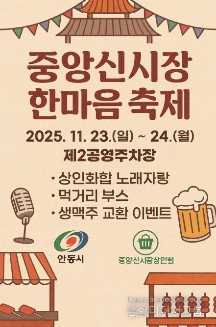 시민행정신문 강갑수 기자 | 안동시는 전통시장 활성화와 지역 상인・시민 간 소통을 위해 ‘2025 안동 중앙신시장 한마음 축제’를 오는 11월 23일부터 24일까지 2일간 중앙신시장 제2공영주차장에서 개최한다.