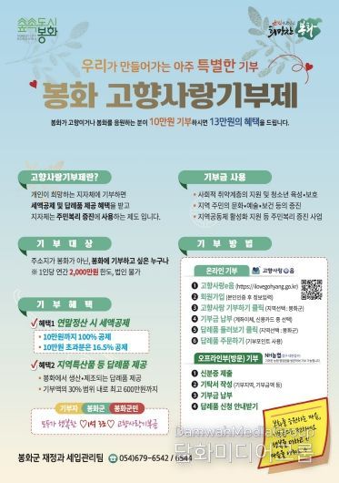 박현국 봉화군수는 “3년 연속 고향사랑기부금을 보내주신 권석형 대표님께 깊은 감사의 말씀을 드린다”며, “기탁금은 사회취약계층 지원과 군민 복지 향상을 위해 소중하게 사용하겠다”고 말했다.