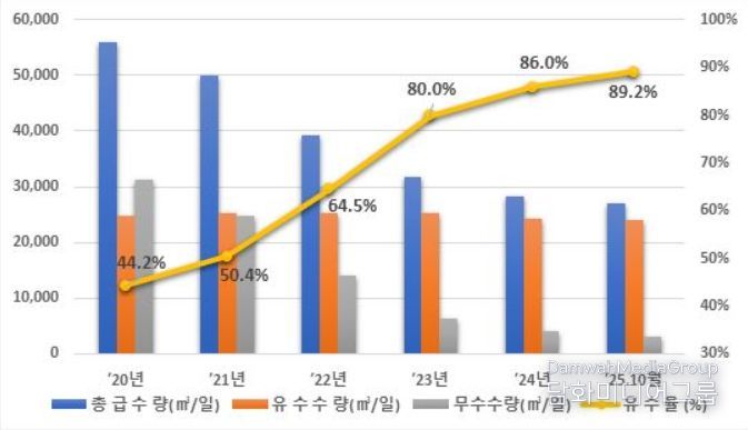 유수율은 정수장에서 생산된 물 중 수도요금으로 정상 회수된 양의 비율을 뜻한다. 누수 없이 효율적으로 운영하는지 판단하는 핵심 지표로, 유수율이 높을수록 물 손실이 적고 안정적인 공급이 가능하다는 의미다.