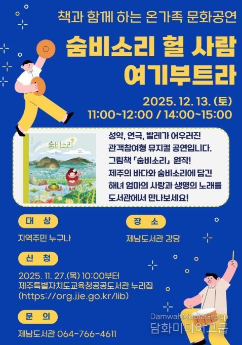 시민행정신문 기자 | 제주도교육청 제남도서관은 12월 13일 오전 11시와 오후 2시 두 차례 유아·초등학생과 보호자, 지역주민 200명을 대상으로 책과 함께 하는 온가족 문화공연 ‘숨비소리 헐 사람 여기부트라’를 운영한다.