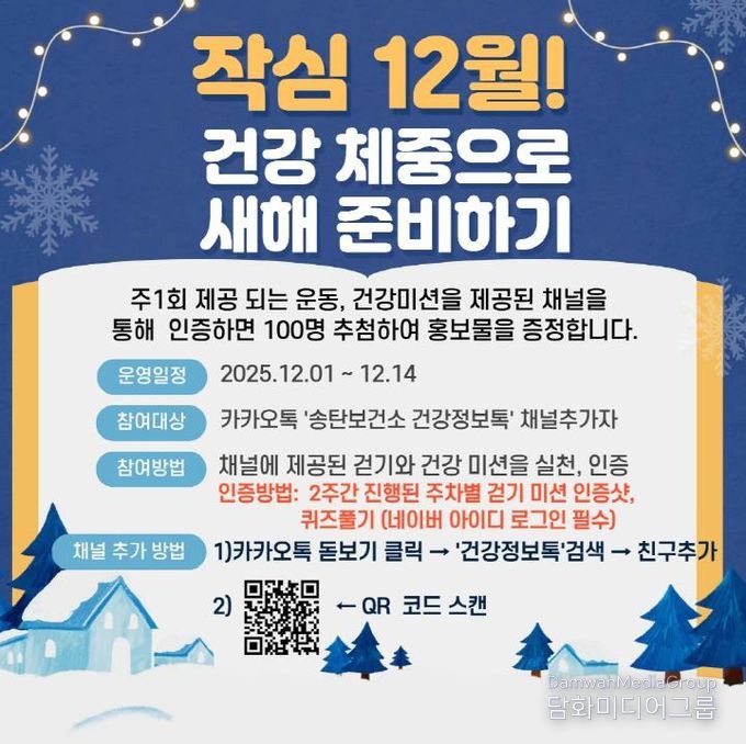 시민행정신문 기자 | 평택시 송탄보건소는 건강한 생활 습관으로 새해를 맞이할 수 있도록 12월 1일부터 2주간 ‘작심 12월! 건강 체중으로 새해 준비하기’챌린지를 운영한다고 밝혔다.