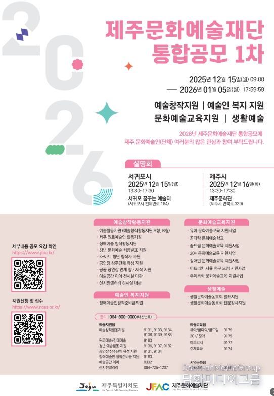 시민행정신문 기자 | 제주문화예술재단(이사장 김석윤)은 2026년도 지원사업 1차 통합공모를 실시한다. 접수 기간은 2025년 12월 15일부터 2026년 1월 5일까지이며, 문화예술교육 지원사업은 2026년 1월 9일까지 접수한다.