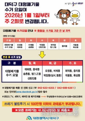 시민행정신문 김학영 기자 | 대전 대덕구는 주민 생활편의를 높이고 불법투기를 예방하기 위해 2026년 1월부터 대형폐기물 수거일을 동별 주 2회로 확대 운영한다.