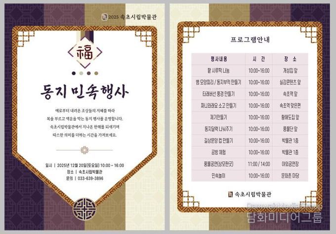 이병선 속초시장은 “박물관 동지 행사가 가족과 함께 즐겁고 의미있는 시간이 되길 바란다”며 “앞으로도 박물관은 다양한 민속체험 행사를 통해 시민과 관광객을 만날 것”이라고 말했다.