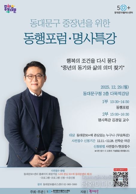 시민행정신문 강갑수 기자 | 서울 동대문구가 중장년의 ‘인생 2막’ 설계를 돕기 위한 공개 포럼과 특강을 연다. 동대문구는 29일 오후 1시 30분 구청 2층 다목적강당에서 ‘동대문50플러스센터 동행포럼·명사특강’을 개최한다고 밝혔다. 2026년 상반기 개관을 앞둔 동대문50플러스센터의 운영 방향을 주민과 공유하고, 지역 여건에 맞는 프로그램을 함께 모색하기 위한 자리다.