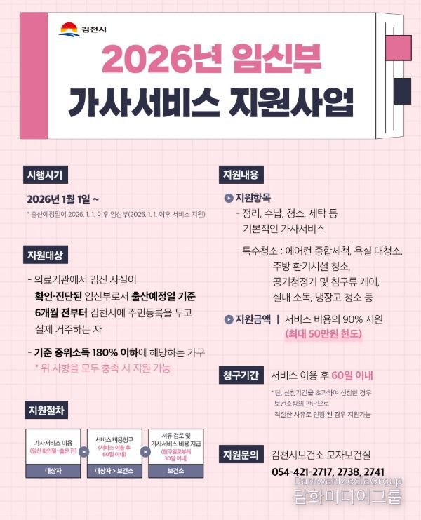 시민행정신문 강갑수 기자 | 김천시는 2026년 1월 1일부터 경상북도 내에서 처음으로 ‘임신부 가사서비스 지원사업’을 본격 시행한다.