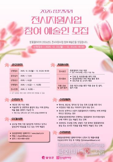 시민행정신문 기자 | (재)달성문화재단은 오는 22일부터 31일까지 ‘2026 참꽃갤러리 전시지원사업 참여예술인’을 모집한다.