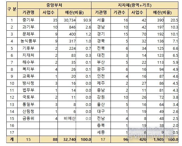지방자치단체(광역 17개, 기초 79개)는 서울(390억원), 경남(197억원), 경기(192억원) 등에서 총 1,905억원, 420개 사업을 추진할 계획이다.