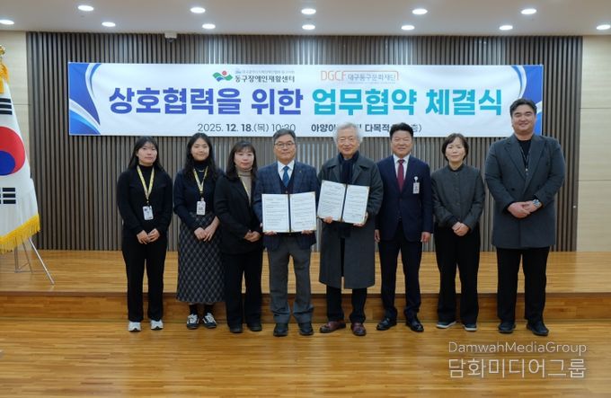 시민행정신문 강갑수 기자 | (재)대구동구문화재단(이사장 윤석준)과 동구장애인재활센터(센터장 이종근)는 지난 12월 18일, 지역 장애인의 건강증진과 생활체육 활성화를 위한 업무협약(MOU)을 체결했다.