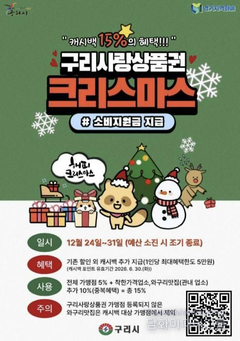 시민행정신문 강갑수 기자 | 구리시는 12월 24일부터 ‘구리사랑상품권 크리스마스 소비 지원금’을 지급한다고 밝혔다. 이번 소비 지원금은 연말연시 기간 지역 외로 유출되는 소비를 지역 내로 유도하고, 관내 상권 활성화와 소상공인 보호를 위해 마련됐으며, 예산 소진 시 조기 종료될 수 있다.