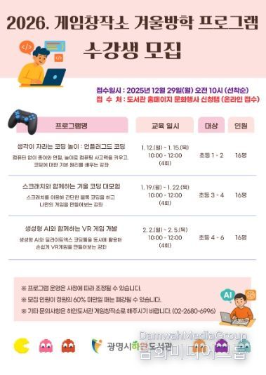 교육과정은 2026년 1월 12일부터 2월 5일까지 운영하며, ▲‘생각이 자라는 코딩놀이: 언플러그드 코딩’ ▲‘스크래치와 함께하는 겨울 코딩 대모험’ ▲‘생성형 AI와 함께하는 VR 게임 개발’ 등 총 3개 과정으로 진행한다.
