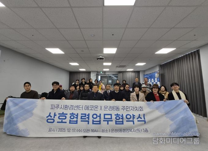 시민행정신문 강갑수 기자 | 운정6동 주민자치회는 12월 17일 오전 10시, 운정6동 행정복지센터에서 파주시환경센터 ‘에코온’과 ‘지역 환경 의제 실천 및 기후행동 협력을 위한 업무협약’을 체결하고, 이어 마을 소식지 '초롱꽃향기로' 2호 제작 성과공유회를 개최했다.
